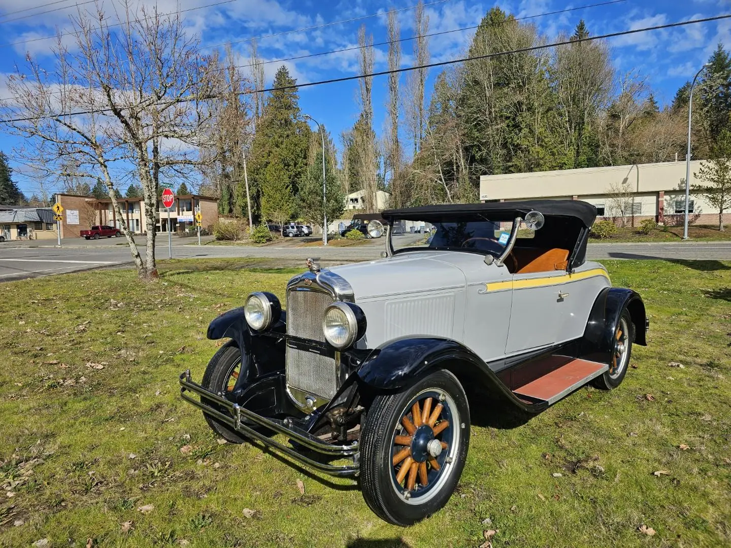 This particular example was refurbished under previous ownership before being acquired by the selling dealer in 2025. It is now offered in Bremerton, Washington, finished in gray with yellow bodyside stripes and black fenders — a color combination that highlights the long hood, upright grille, and sweeping fenders typical of the era.