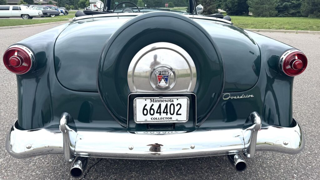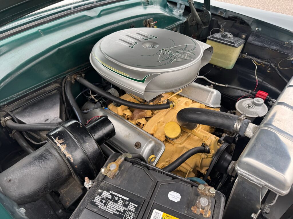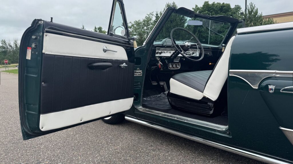 One of the standout features of this Crestline Sunliner is its operational power convertible top, a luxury in 1954 and still functioning well today. Inside, the black and white cabin is simple but tidy, featuring manual windows and door hardware along with clean upholstery. An aftermarket gauge trio—covering oil pressure, amperage, and coolant temperature—has been added for improved mechanical monitoring without detracting from the car’s period feel.