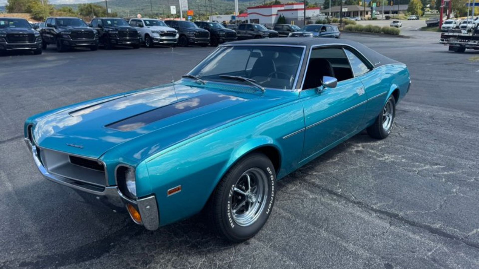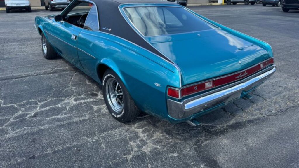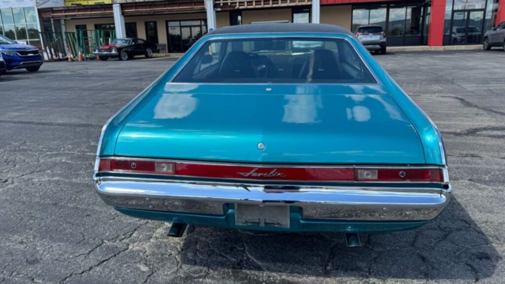 Finished in turquoise with black stripes and a matching black vinyl top, the Javelin presents a striking profile that remains instantly recognizable among muscle car enthusiasts. Stock chrome Magnum 500 wheels complete the period look, while the dual exhaust system hints at the performance beneath the hood.