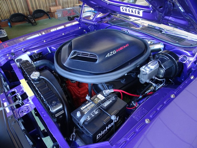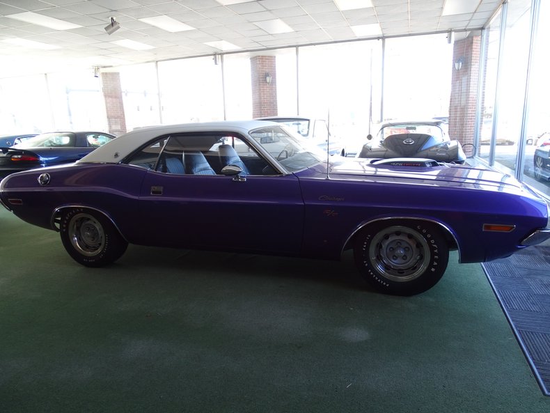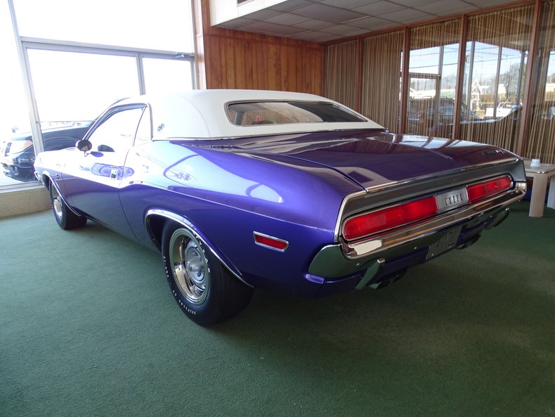 Finished in factory Plum Crazy Purple, the Challenger features a white vinyl top, a combination that has become synonymous with early 1970s Mopar styling. The exterior presentation is the result of a frame-off restoration, returning the car to a show-quality appearance while highlighting the bold design that helped define the Challenger’s debut year.