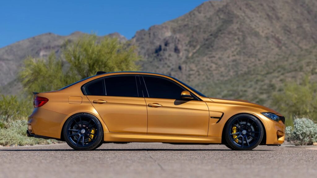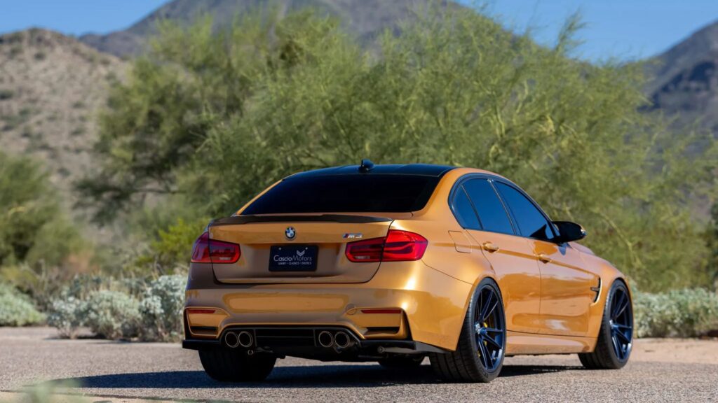 The car was collected new through BMW’s European Tourist Delivery program and later registered in Montana and Arizona. The current owner purchased it in 2017 and added roughly 15,000 miles. Finished in BMW Individual Sunburst Gold Metallic, the M3 carries widened F80 bodywork and Shadowline trim, along with aftermarket OneEighty headlights, an M4-style rear spoiler and a Mode Carbon rear diffuser. Records show the front bumper sustained “minor” damage in early 2019, according to a Carfax entry. The bumper was repainted under the seller’s ownership, and the lower-right intake trim was replaced prior to listing.