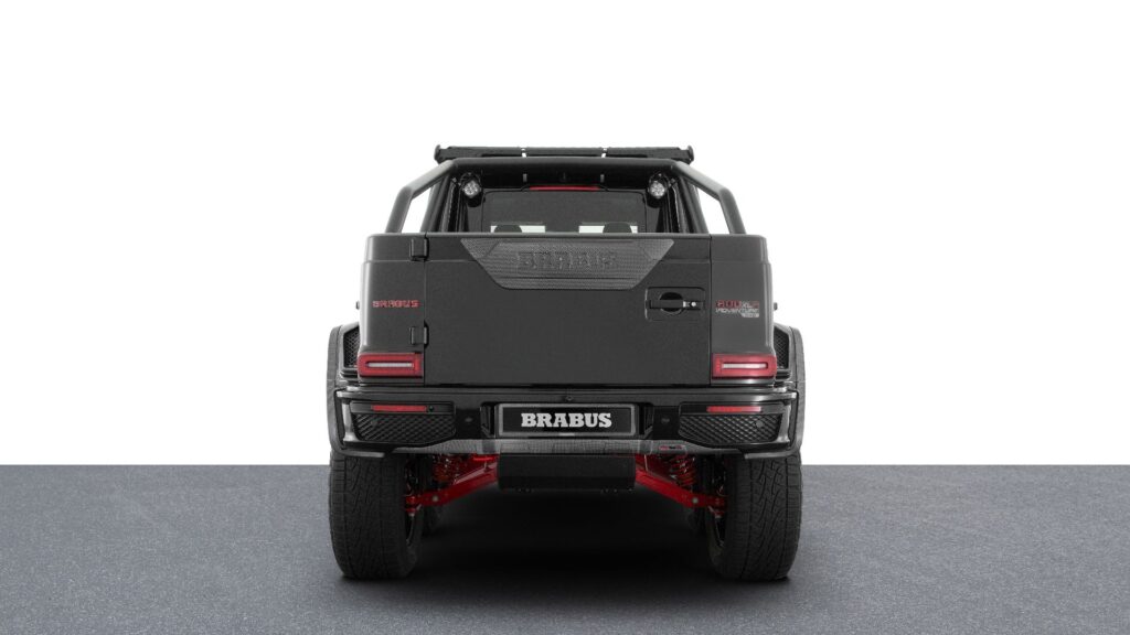 The exterior features Brabus’s Widestar widebody kit, exposed carbon-fiber trim, and 22-inch forged Monoblock HD wheels. Practical additions include a front-mounted winch rated at nearly 10,000 pounds and LED light bars across the roof rack.