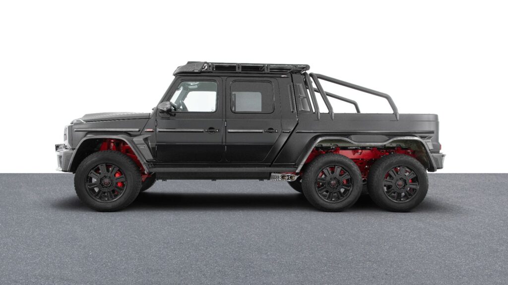 Engineers at Brabus lengthened the G-Class ladder frame by 153 centimeters to accommodate three portal axles, resulting in 47 centimeters (18.6 inches) of ground clearance. The steel frame supports a custom cargo bed lined with teak and equipped with lockable carbon-fiber storage boxes. A power-retractable step aids access to the bed, while a matte black dual roll bar and integrated LED lighting complete the rugged profile.