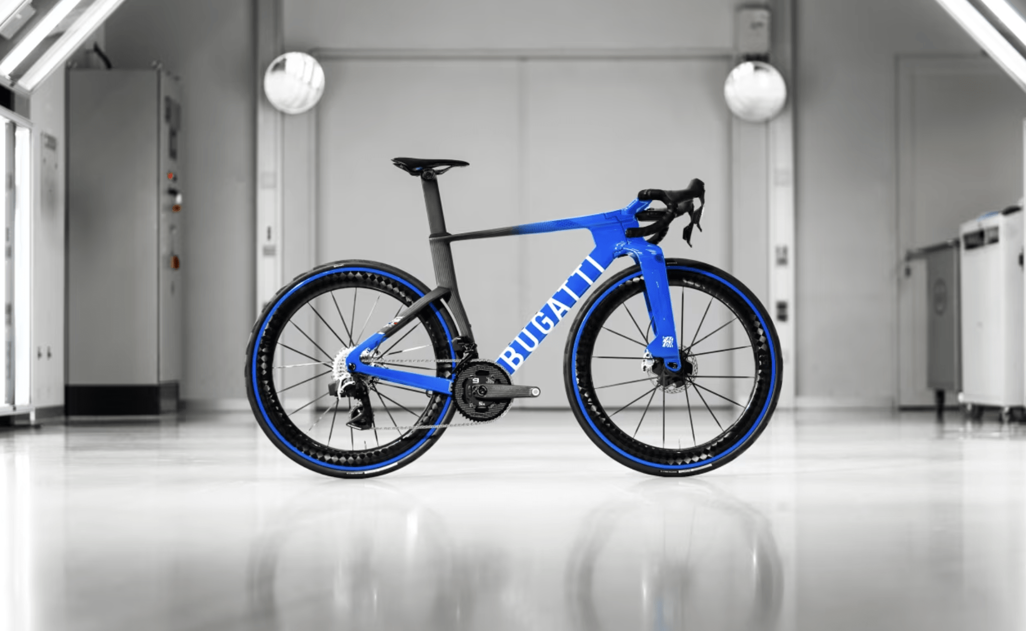 The bike is equipped with a specialized wheelset developed under the Black Inc Bugatti Hyper 62 name. The carbon rims are notably lightweight and engineered for stiffness, efficient power transfer, and stability in crosswinds. The setup is paired with performance-focused tires featuring distinctive French Racing Blue sidewalls, reinforcing the brand’s heritage.