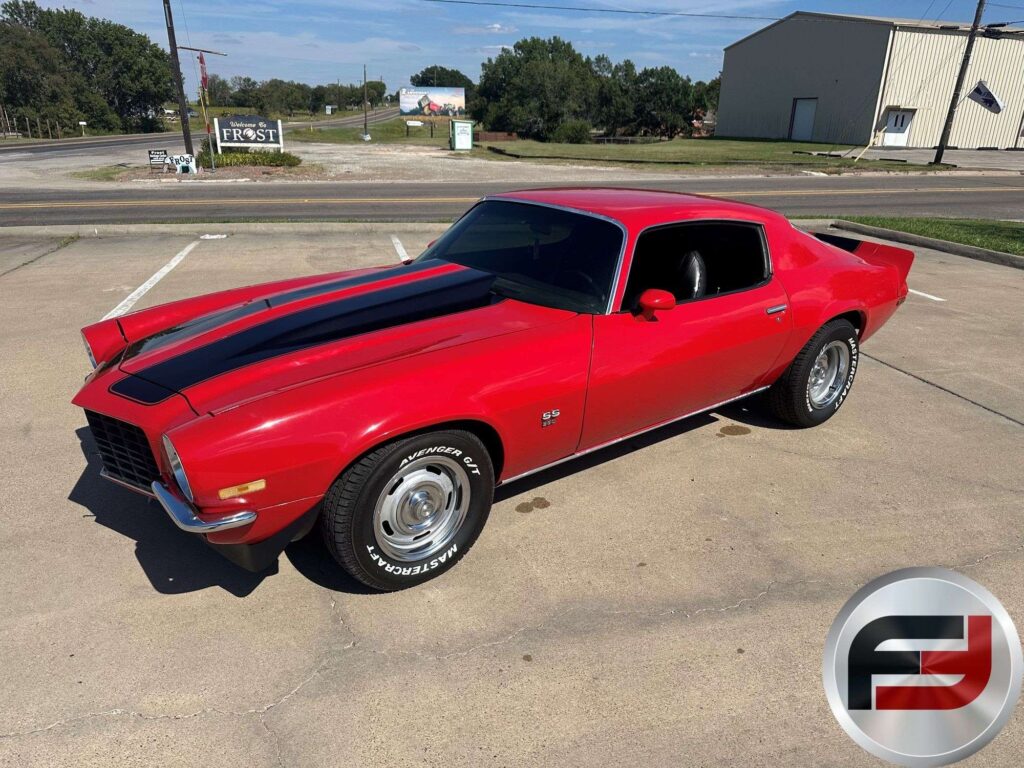 Another on-site entry is a 1972 Camaro fitted with a 350-ci Ram Jet V8 and a 3-speed automatic transmission. Finished in red with black stripes over a black leather interior, the car carries rally wheels wrapped in Master Avenger G/T white-letter tires. Features include bucket seats, center console, chrome bumpers and trim, and a rear spoiler. The odometer shows 68,660 miles. This car is also offered with a reserve.