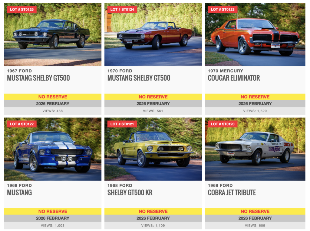 Each vehicle has been assigned a dedicated lot number within the February sale catalog, with the Shelby GT500 KR and Boss 302 among the most-viewed listings leading into the event. The diversity of years, trims, and performance identities within the collection offers appeal to a wide range of Mustang enthusiasts, from collectors focused on Shelby-era prestige to those drawn to Boss and Cobra Jet performance themes.