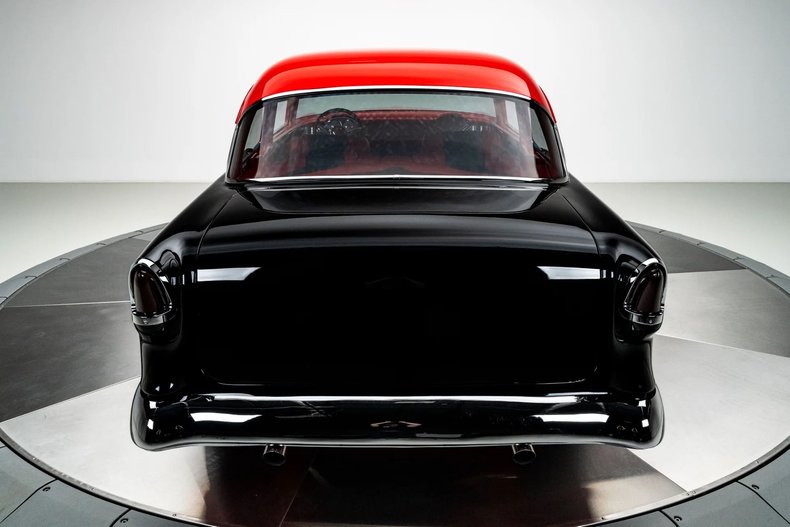 The restoration, which exceeded $250,000 in cost, involved stripping the car down to its bare structure before rebuilding it with updated components throughout. The result is a reimagined version of the iconic mid-1950s Chevrolet, finished in a red and black exterior that is matched by a custom red and black leather interior.