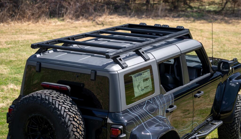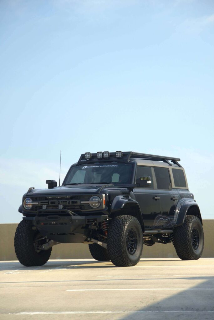 Sharing garage space with the Mustang is a customized 2024 Ford Bronco Raptor prepared by CJ Pony Parts. From the factory, the Bronco Raptor features a 455-horsepower twin-turbocharged V-6, Fox suspension and 37-inch all-terrain tires. Enhancements include a Ford Performance Power Pack, AWE cat-back exhaust with BashGuard tips, DV8 bumpers and side steps, Eibach ProLift springs, 17-inch Fuel wheels and Oracle lighting. The upgrades position the Bronco for demanding trails while maintaining everyday drivability.