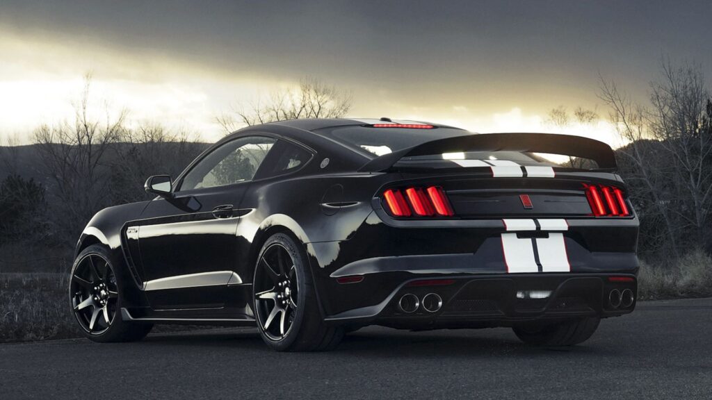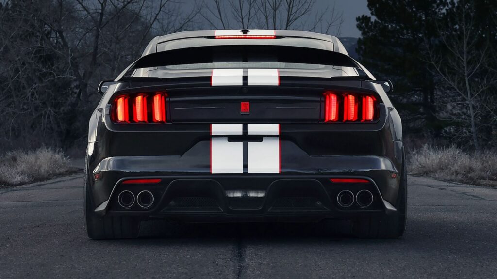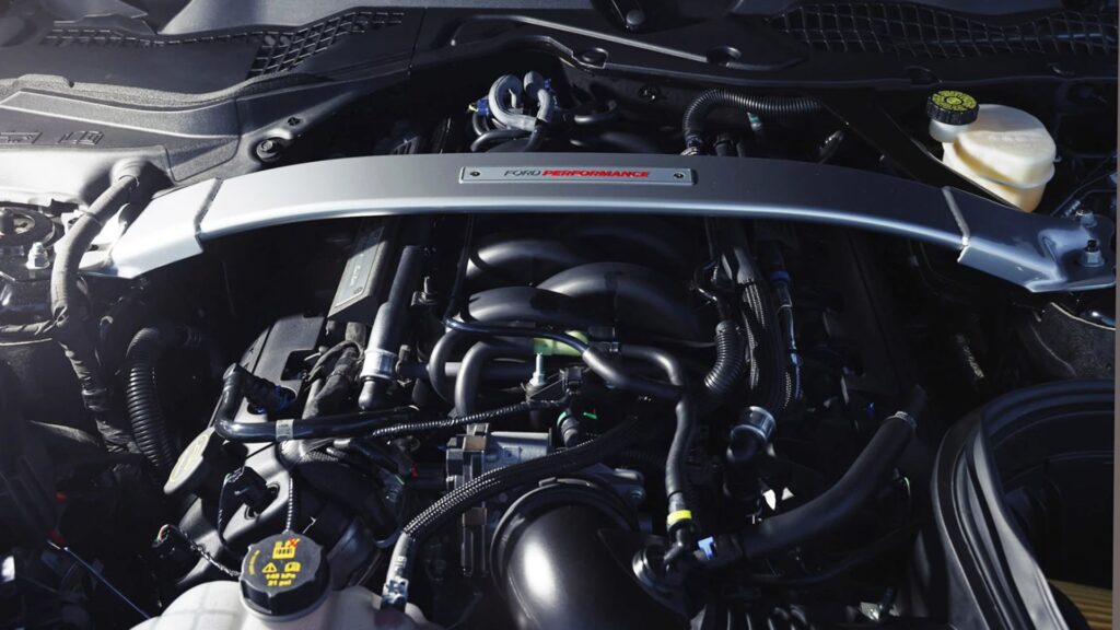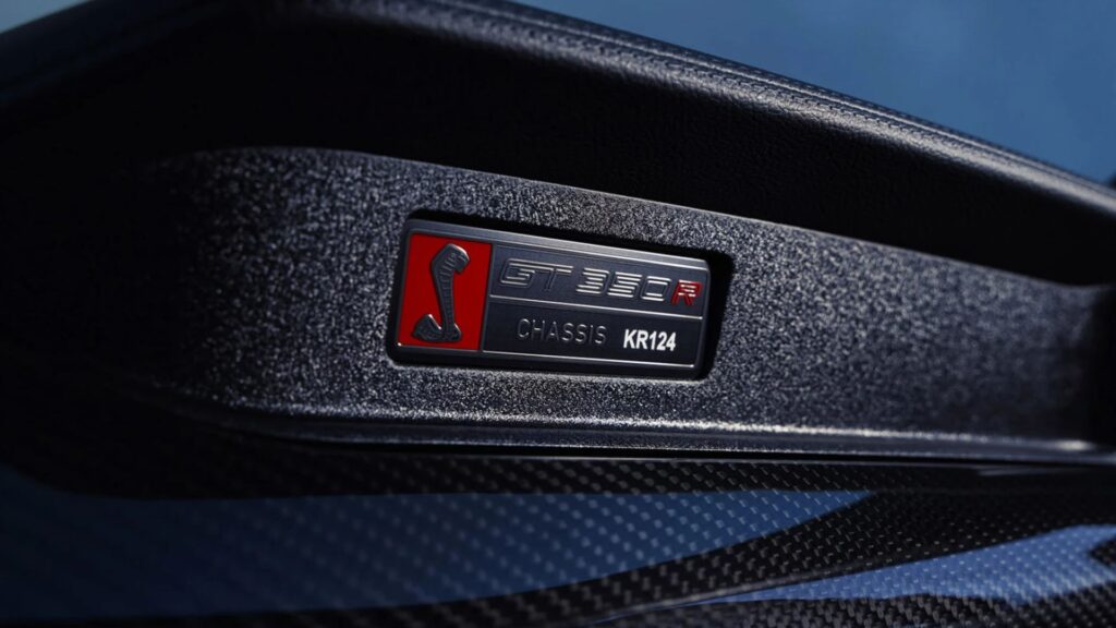 Under the hood sits Ford’s 5.2-liter “Voodoo” V-8 with a flat-plane crank, factory-rated at 526 hp and 429 lb-ft, paired to a Tremec TR-3160 six-speed manual and 3.73:1 Torsen limited-slip differential. Additional engine, transmission and differential coolers were standard on the “R.” The steering wheel is Alcantara-wrapped, and the analog/digital cluster includes a 200-mph speedometer, 8,250-rpm redline tachometer, and auxiliary oil temperature and pressure gauges.
