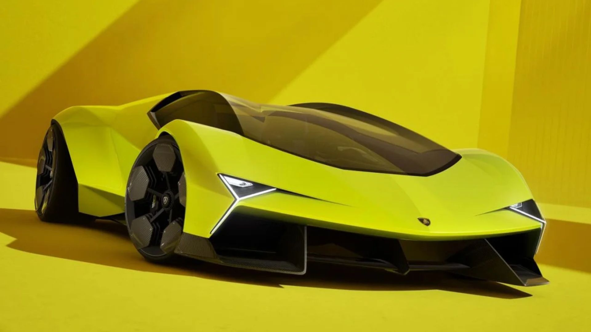 Drenched in brilliant yellow, the Manifesto merges classic Lamborghini traits — defined edges, powerful posture, and dynamic contours — with fresh, avant-garde elements. The front boasts triangular headlights merged with Y-shaped LED lights, while the rear mirrors this theme through sculpted Y-shaped taillamps and a prominent diffuser anchoring the lower section.