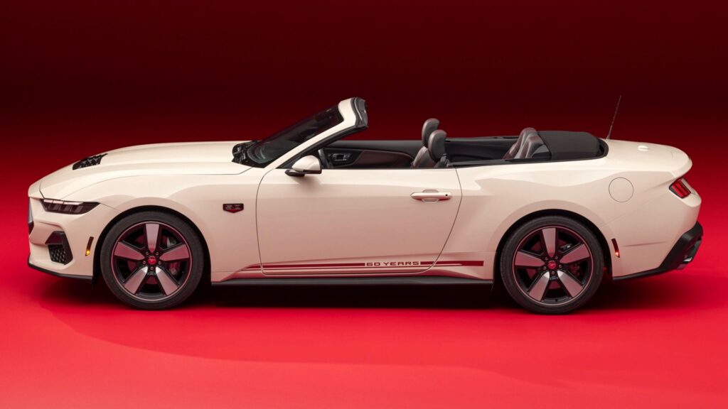 The grand prize is a Wimbledon White 60th Anniversary GT convertible trimmed in Carmine Red leather and limited to 1,965 vehicles. The commemorative package includes a red exterior stripe and heritage cues, while the GT’s 5.0-liter Coyote V-8 anchors the performance. This prize car is equipped with the 401A High Package (Premier Trim with Color Accent Group, Security Package, Ford Co-Pilot360 Assist+, memory driver seat and illuminated door-sill plates), Active Valve Performance Exhaust, and a 10-speed automatic paired to a 3.55 limited-slip rear axle.