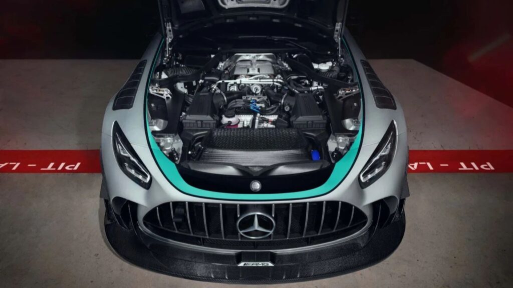 The GT2 Edition W16 draws its name from Mercedes-AMG’s Formula 1 car designation and features a racing livery modeled after the team’s grand prix machines. Under the hood is a 4.0-liter twin-turbocharged V8 paired with a six-speed sequential gearbox. With the Push2Pass system engaged, the car delivers up to 818 horsepower and 738 pound-feet of torque, making it the most powerful track-only customer offering in AMG history.