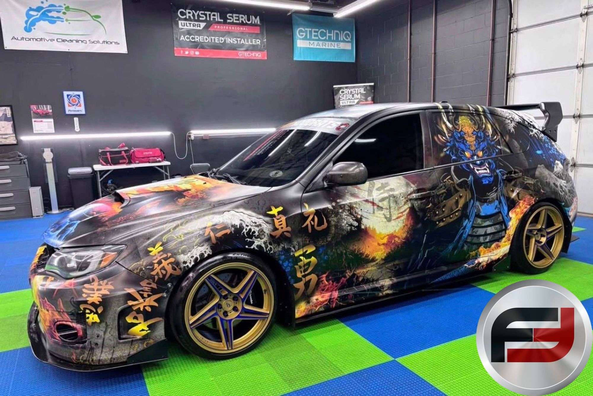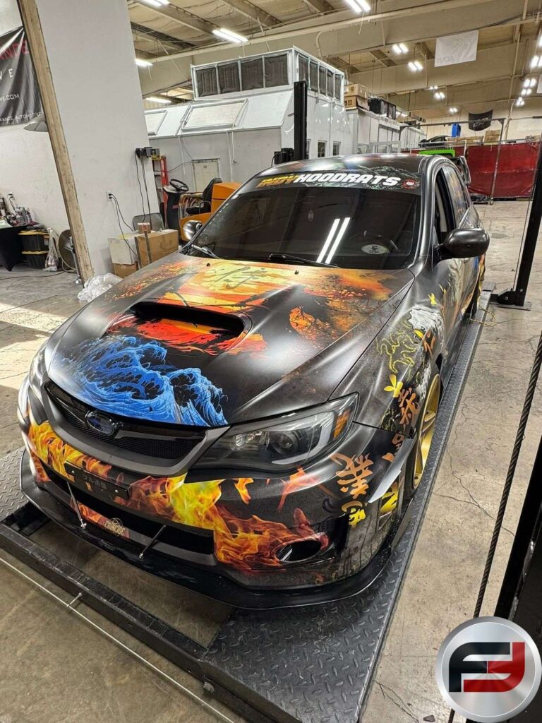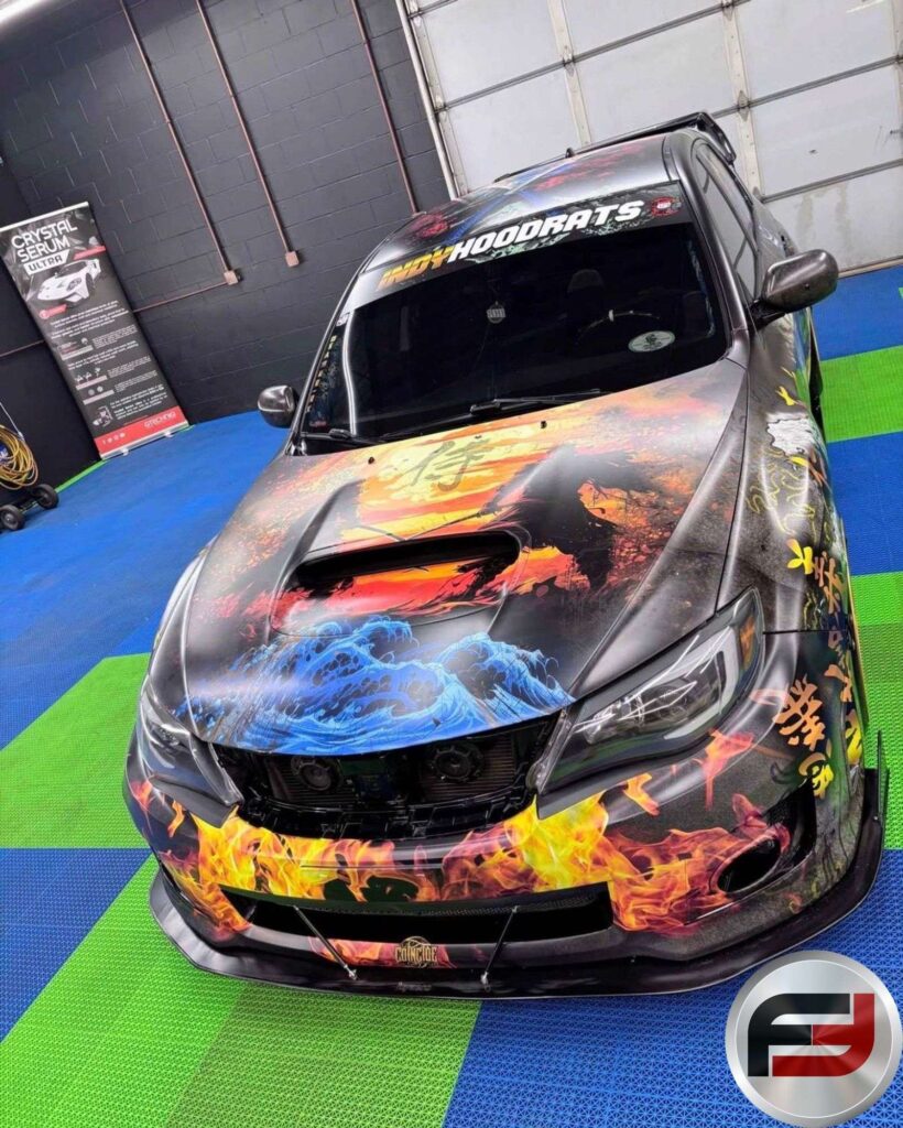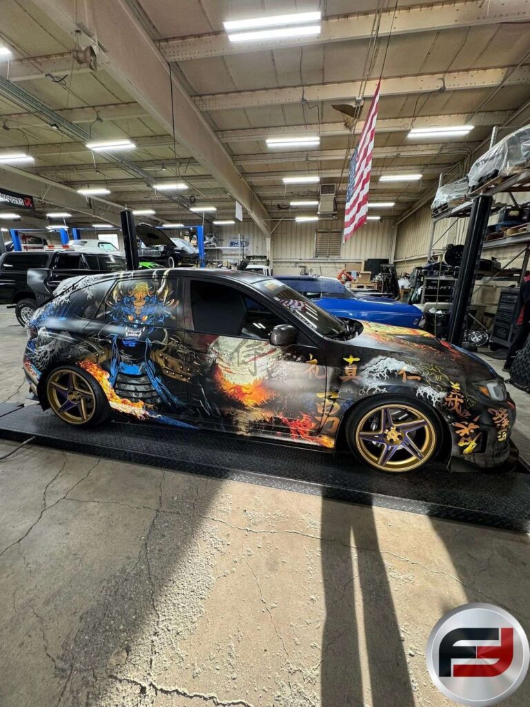 Visually, the Impreza features a range of aftermarket styling elements, including a rear wing, aerodynamic body components, and a custom lighting system with underglow and programmable controls. Inside, the cabin has been customized with upgraded audio components, a starlight headliner, and unique design touches such as a bamboo-accented trunk.