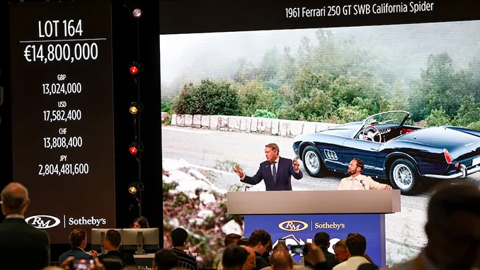 The sale was headlined by a 1961 Ferrari 250 GT SWB California Spider, which brought €16,655,000 and established a new world record for the model at auction. The car, known for its Riviera heritage and meticulous restoration, led a strong showing for Ferrari throughout the event.
