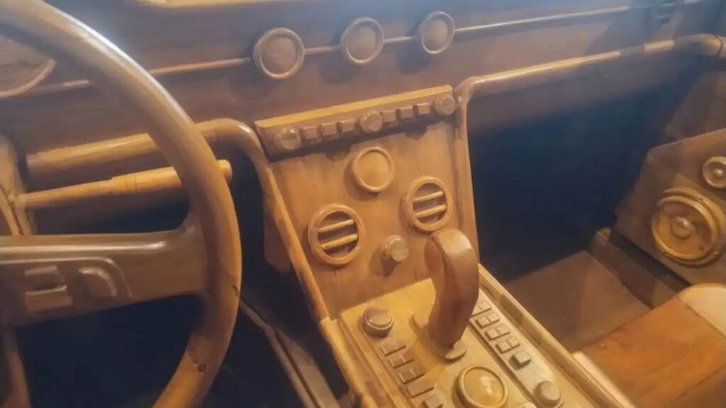 Attention to detail sets this wooden replica apart. The exterior features include carved diamond-pattern grilles, acrylic windows, and opening doors. Inside, the sculptor recreated the entire cabin in wood, including four full-size seats, a dashboard, a center console and detailed touches such as vents, controls, speakers and gauges.