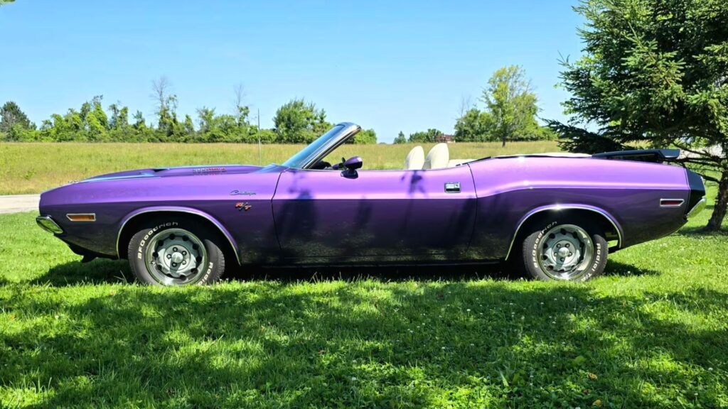 The second Challenger is a factory R/T convertible finished in striking Plum Crazy Purple with a white interior. Originally equipped with a 383 big block, it now carries a legendary 426-cubic-inch Hemi V-8 mated to an upgraded five-speed manual transmission. A Hurst Pistol Grip shifter, power brakes, and Rallye wheels reinforce its performance pedigree, while features like a power top, high-back bucket seats, and rear Bumble Bee stripe maintain its classic appeal.