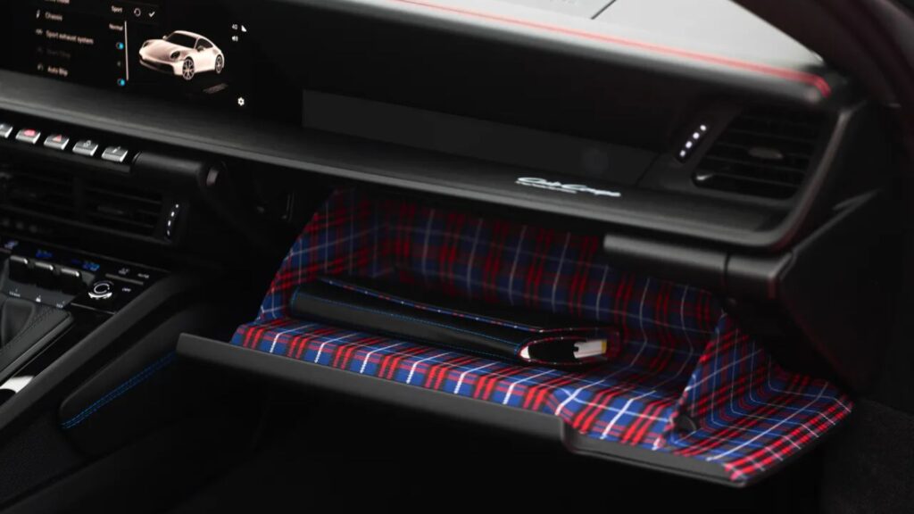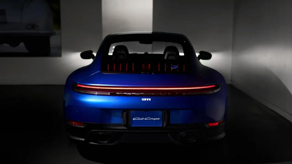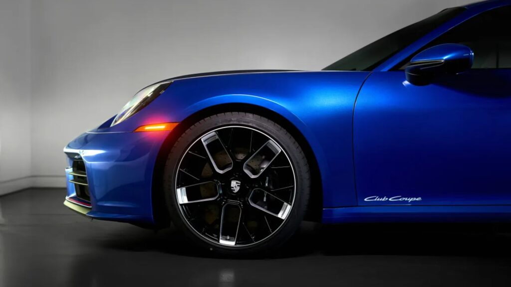 The model debuts in a custom Paint-to-Sample finish called Sholar Blue, named after PCA founder Bill Sholar. That hue extends to the car’s key, which comes with a matching leather pouch. Inside, the Club Coupe features black leather upholstery with red seat belts and optional tartan inserts for the seat centers and glovebox. Door-mounted projectors beam the PCA logo onto the ground.