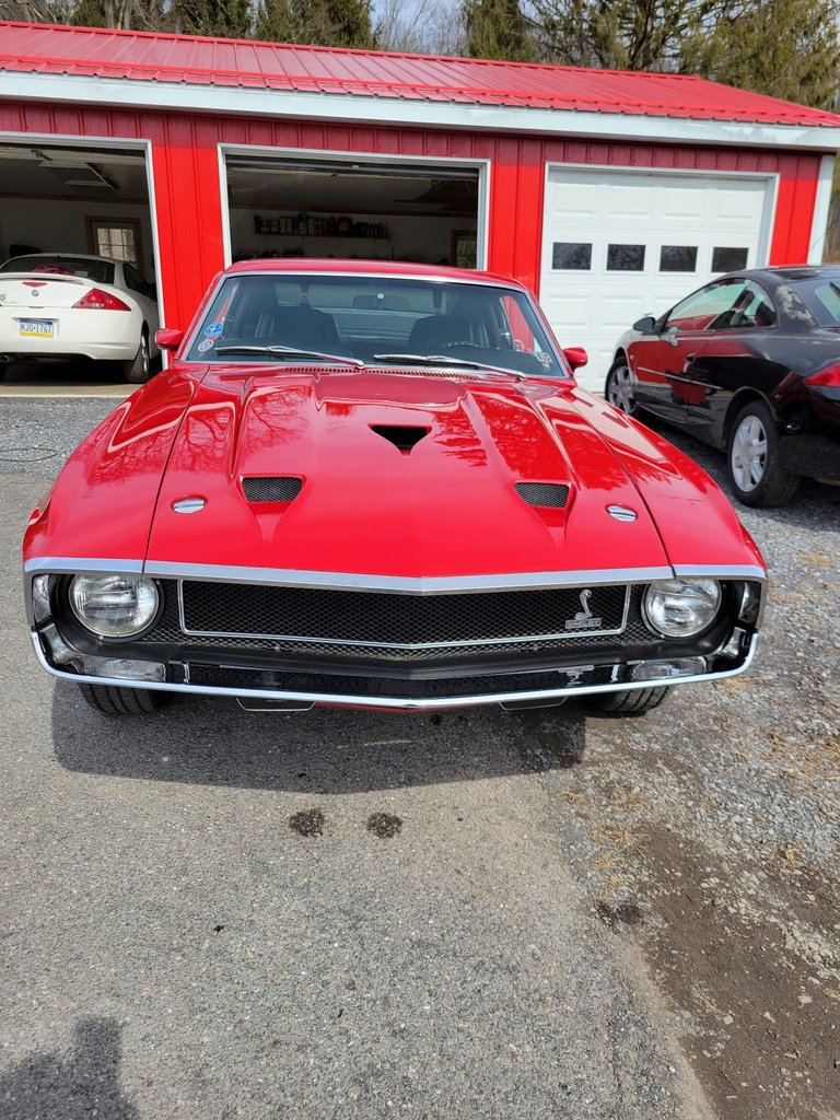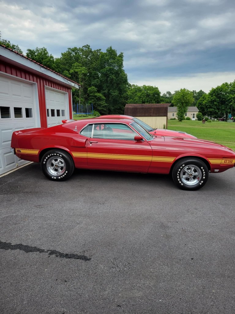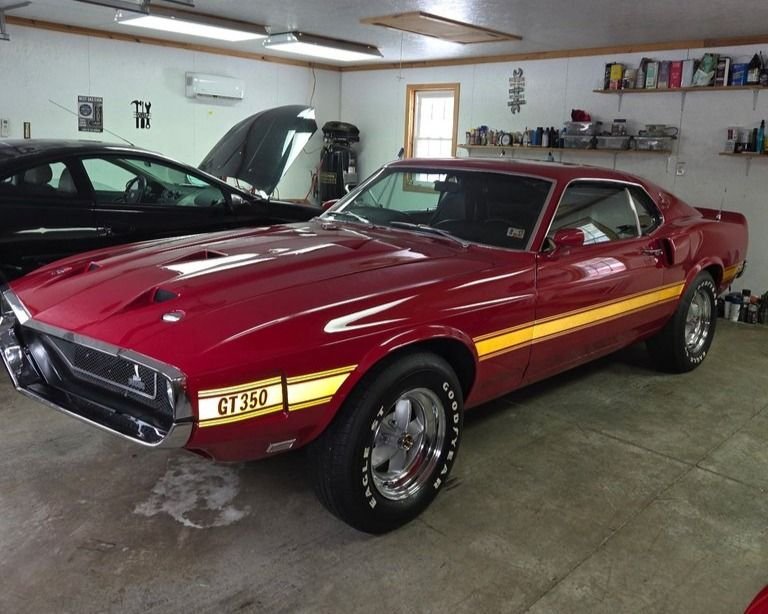 Finished in Candy Apple Red with a black interior, the vehicle retains its identity as a genuine 1969 GT350, identified as serial number 918. Power comes from a 351 Windsor V-8 engine believed to be original, supported by a Toploader four-speed manual transmission also thought to be factory-installed. The engine block carries a 9T18 stamp on the left rear face, further supporting its authenticity, while the transmission features an ID tag marked “RUG-AG,” indicating a close-ratio setup with a 2.32 low gear.