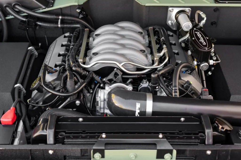 At the heart of the build is a 5.0-liter Gen II Coyote V8 engine paired with a four-speed automatic transmission and a twin-stick Atlas dual-range transfer case. The setup allows power delivery to either the rear wheels or all four wheels through a Dana 44 front axle and Ford 9-inch rear end, offering versatility for both on-road and off-road driving.