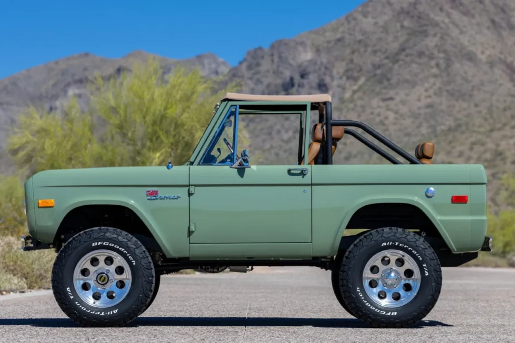 The Bronco’s exterior was refinished in Boxwood Green during the restoration process, complemented by a tan canvas top and chrome bumpers. Additional exterior upgrades include LED headlights and power-retractable side steps. The SUV rides on 17-inch polished Pacer wheels fitted with BFGoodrich All-Terrain tires, supported by Bilstein shocks, upgraded springs, and both suspension and body lifts.