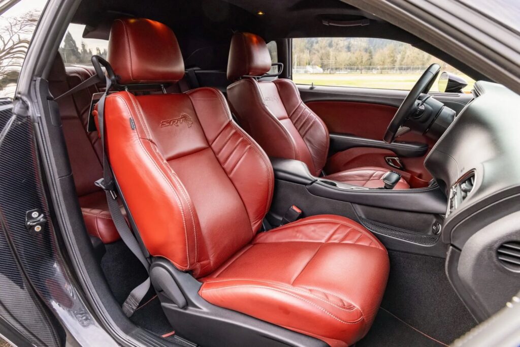 This Challenger Hellcat reportedly received its transformation from Six Twelve Auto Worx, utilizing molded carbon-fiber bodywork designed to echo the Charger’s unmistakable profile. The exterior is finished in Demon Smoke clearcoat with a red rear stripe and includes period-inspired and modern elements such as a cowl hood, HID Air Catcher headlights, LED taillights, a carbon-fiber taillight surround, and a flip-up fuel cap. Additional details include a rear diffuser, scalloped doors, body-color bumpers, and center-exit dual exhaust outlets. The car rides on black 20-inch Y-spoke forged wheels wrapped in Nitto NT555 G2 tires, with a wider setup at the rear.