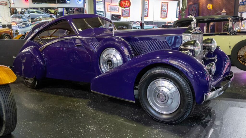 Sharing the spotlight is a 1937 Rolls-Royce Phantom III Aero Coupe, powered by a 7.3-liter V-12 rated at 165 horsepower. Distinguished by its custom Aero Coupe coachwork, the right-hand-drive example features aluminum cylinder heads, hydraulic lifters, and a triple-pressure oiling system paired with a four-speed synchromesh manual transmission. Finished in Indigo blue with dual side-mounted spares and a Lalique Chrysis radiator mascot, the coupe’s interior showcases lilac Scottish leather, black walnut burl veneer, European goose-down cushions, and English wool carpeting. The lavish details underscore Rolls-Royce’s reputation for luxury and individuality in the prewar era.