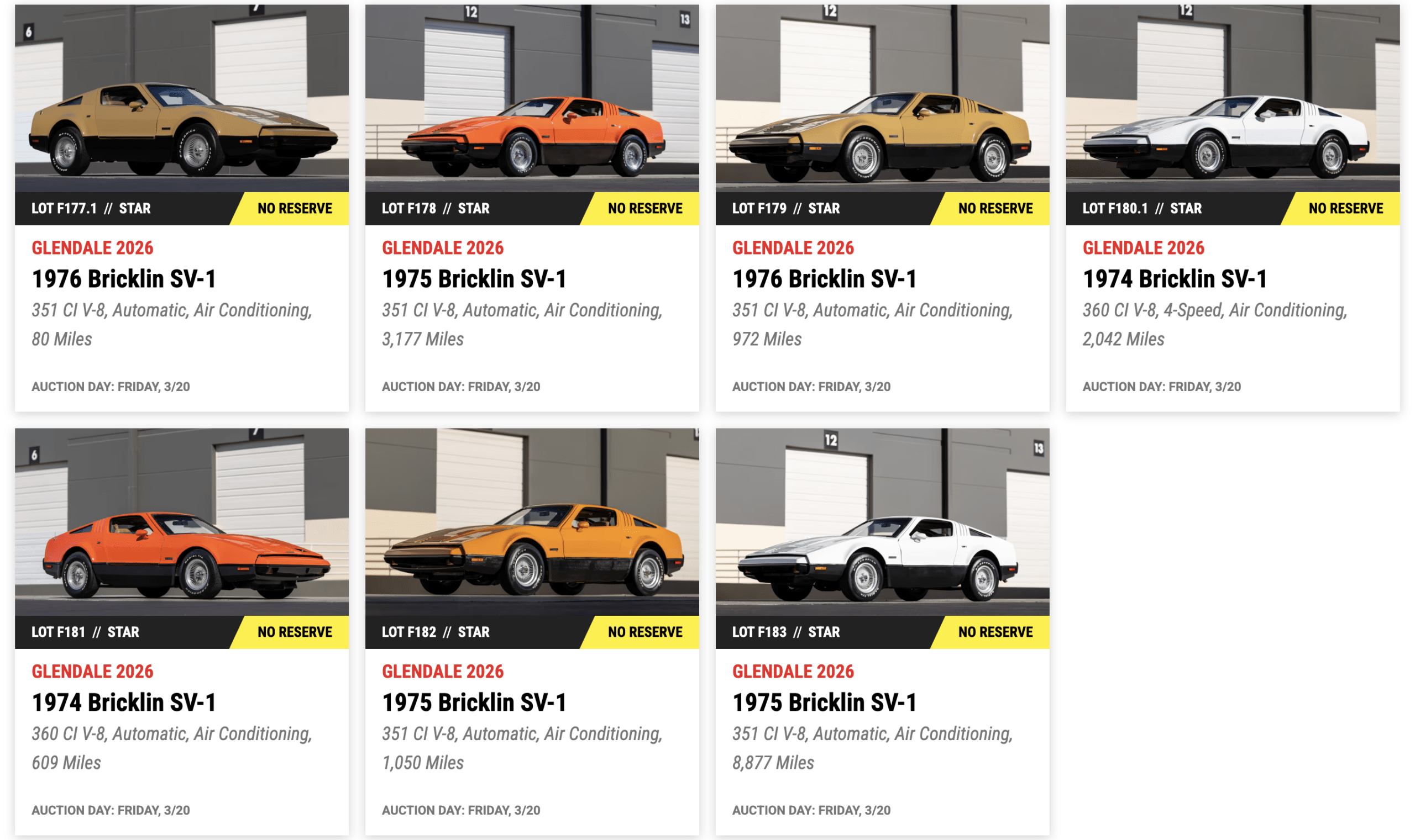 Finding a single well-preserved Bricklin SV-1 is uncommon—finding seven in one collection, all with low mileage and offered simultaneously, is virtually unheard of. The inclusion of both AMC 360-powered early cars and later Ford 351-powered models adds depth for collectors looking to compare and acquire across production years.
