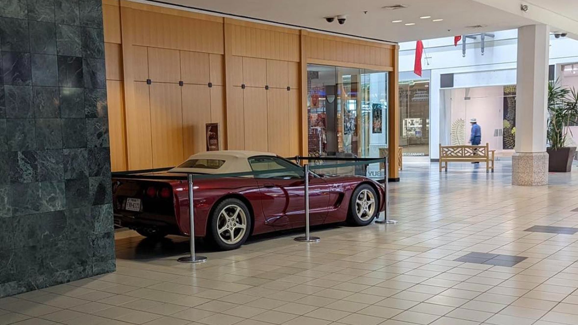 That same Corvette—metallic burgundy, roped off and untouched—still sits in the middle of a mostly empty mall. No crowd, no fanfare. Just a gleaming time capsule idling in neutral while the world moved on around it.