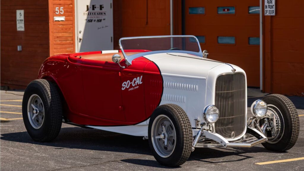 Rounding out the group is a high-performance icon from the world of hot rods—the 1932 Ford So-Cal Speedster. Finished in Red and White So-Cal Speed Shop livery, it’s powered by a 383 CI stroker V-8 mated to a 5-speed manual. Inside, the Tan leather interior, Moon Eyes tachometer, and Pete Chapouris signature pay tribute to So-Cal’s historic legacy. Custom So-Cal wheels, Stahl Sport Radials, and a chopped windshield complete this striking build, a perfect example of craftsmanship meeting cultural significance.