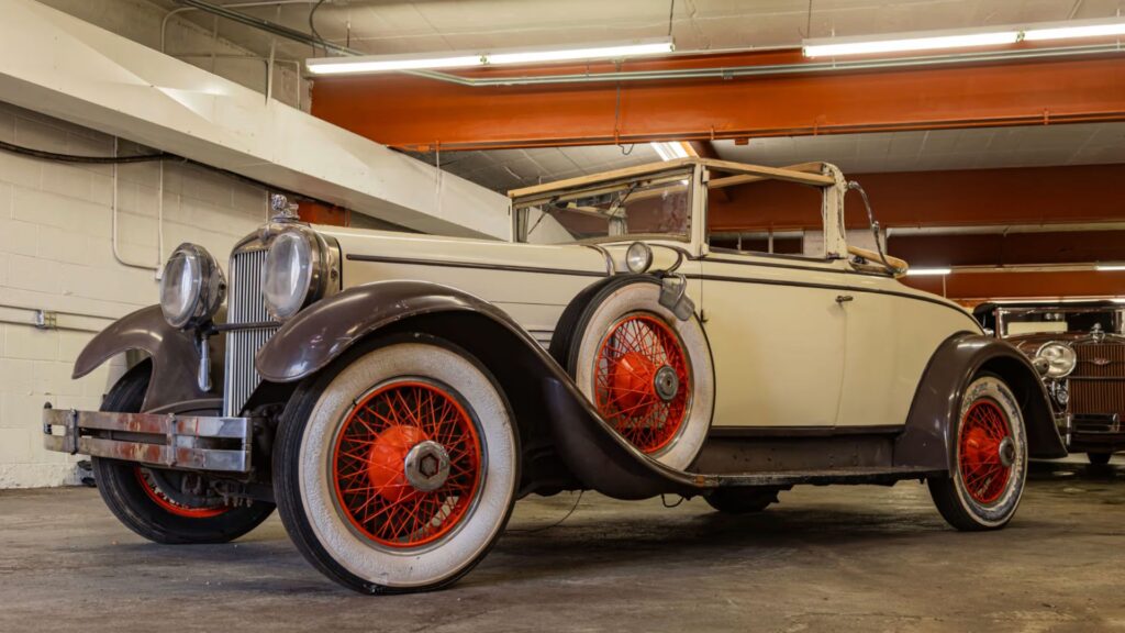 Leading the trio is a beautifully preserved 1930 Stutz MB Convertible Coupe, powered by a 322 CI inline-eight paired with a 4-speed manual transmission. Presented in a White and Brown two-tone finish over a Beige interior, this Stutz exemplifies the marque’s reputation for blending luxury with power. Inside, wood trim, Stewart-Warner gauges, and a Borg electric clock set the tone for prewar elegance. Chrome bumpers, orange-painted wire wheels, and an Egyptian Sun God Ra mascot complete this majestic convertible’s period-correct charm.