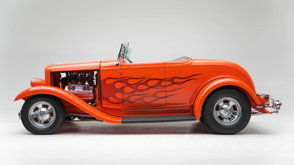 Immediately following is Lot V311, a 1932 Ford Roadster known as “Orange Twist,” winner of the America’s Most Beautiful Roadster award in 1988. Finished in orange with a black interior, the car was built by Ernie Immerso and stands as a showcase of traditional craftsmanship. Unlike many modern builds, Orange Twist retains an authentic all-steel 1932 Ford chassis and body.