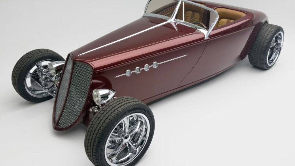 The design was led by hot rod visionary Gary Ragle, with construction handled by Scott’s Hot Rods & Customs of Oxnard, California. The bodywork includes a hand-built custom body with an elongated nose, while paint and finishing were completed by Palmer’s Custom Paint & Body. The interior, crafted by Ron Mangus Custom Hot Rod Interiors, incorporates bespoke details throughout, including custom instrumentation designed to resemble Breitling chronograph watches and unique electric switches. The car rides on one-off billet wheels and is accompanied by custom luggage sets, including both picnic and bar configurations tailored to the interior.