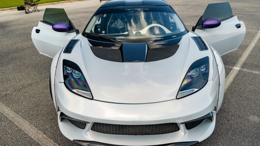 Finished in Arctic Silver Metallic beneath a Rainbow Metallic Majestic White vinyl wrap, the Evora features a custom widebody kit with Clinched rear overfenders, a GTE-style carbon front bumper, a Ferrari F430-inspired diffuser, and a massive GT wing. A LOWGLOW underbody lighting kit and matte purple Forgestar wheels further add to its aggressive, attention-grabbing presence.