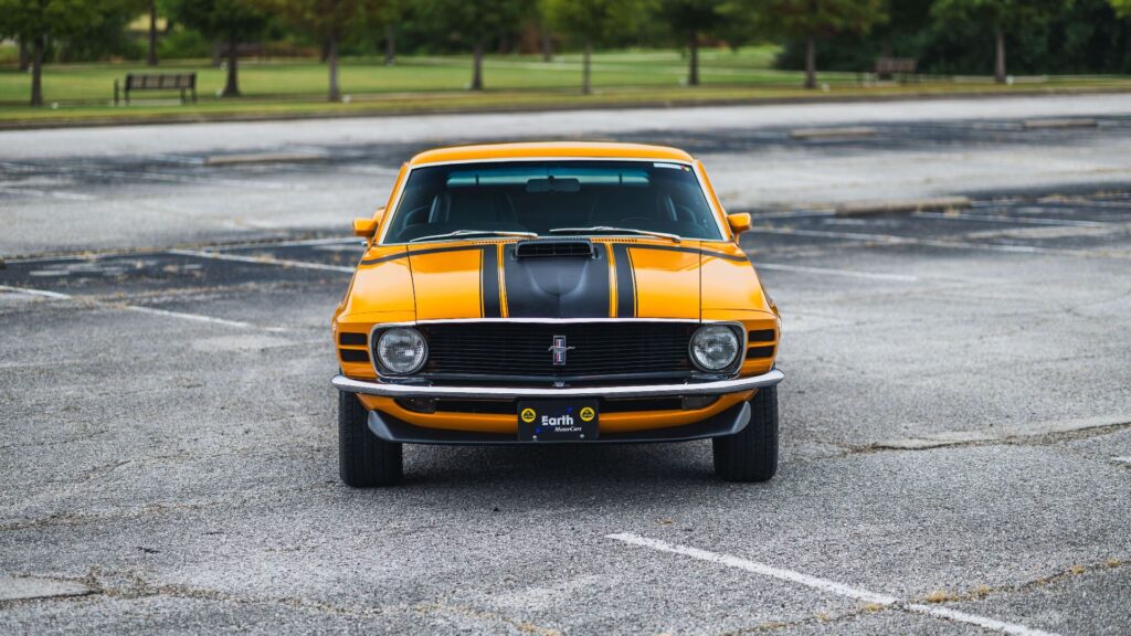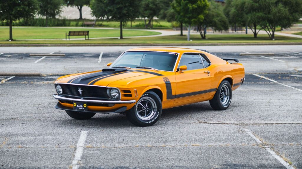 The featured Mustang is finished in Grabber Orange, a color closely associated with high-performance Ford models of the early 1970s and widely regarded as one of the most recognizable finishes of the muscle car period. The Boss 302 was developed during the height of factory-backed performance wars and built to meet homologation requirements for competition, giving it lasting credibility among collectors and enthusiasts.
